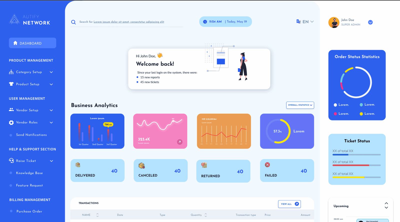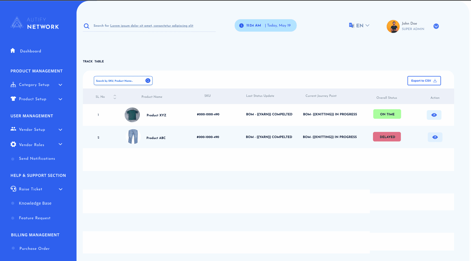 - Design a clean, intuitive dashboard for day-to-day supply chain operations - Centralize documents, vendors, categories, and products - Streamline billing & purchase order (PO) workflows - Enable real-time tracking across every operational step